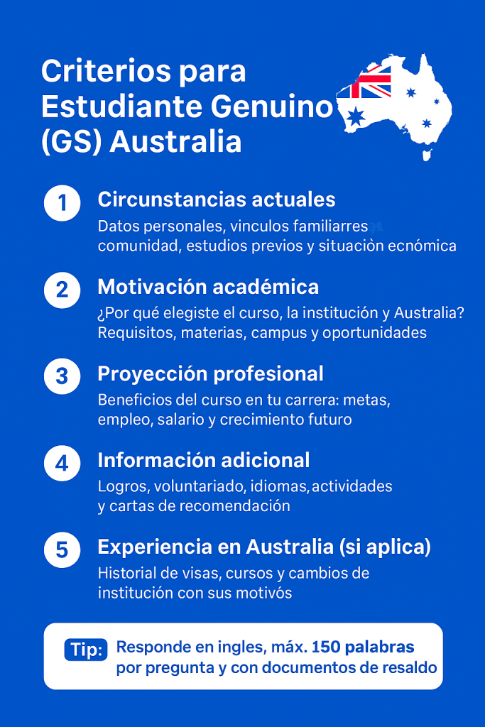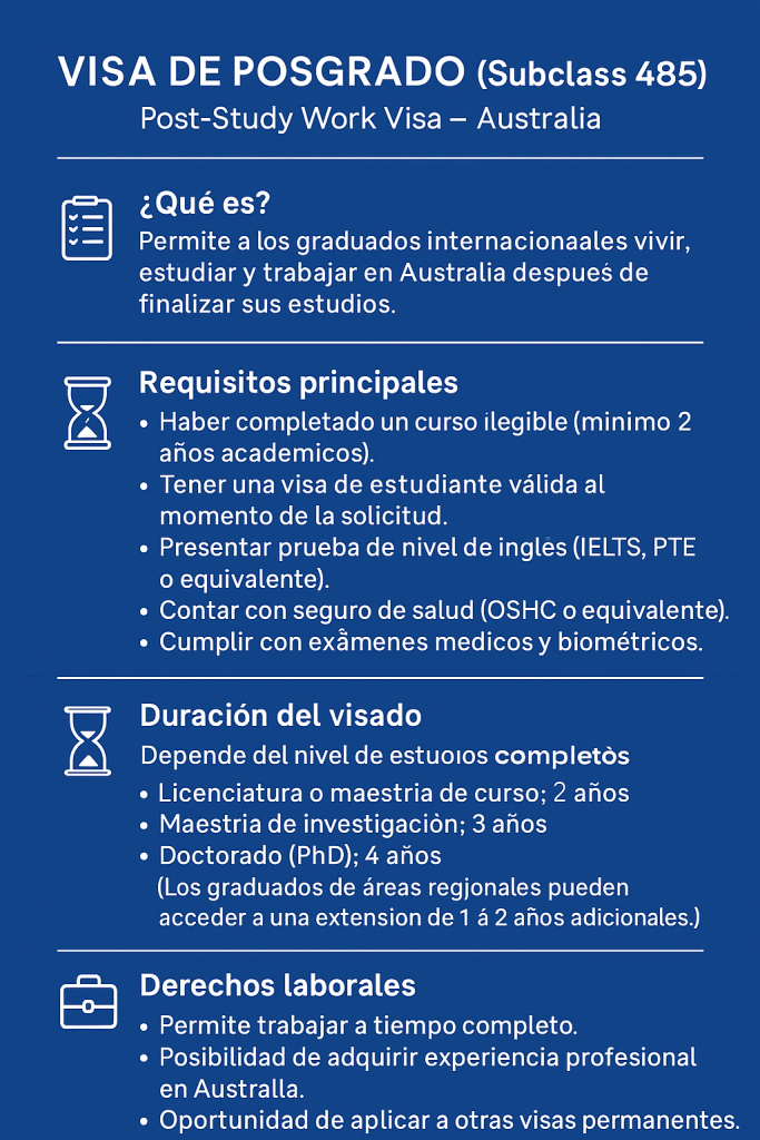 La Visa de Estudiante (Subclass 500) permite a estudiantes internacionales vivir, estudiar y trabajar en Australia mientras realizan un curso registrado a tiempo completo en una institución educativa reconocida. Con esta visa, podrás acceder a universidades y centros de formación de clase mundial, trabajar hasta 48 horas por quincena durante el período académico y tiempo completo en vacaciones, y disfrutar la experiencia de vivir en uno de los destinos estudiantiles más atractivos del mundo.